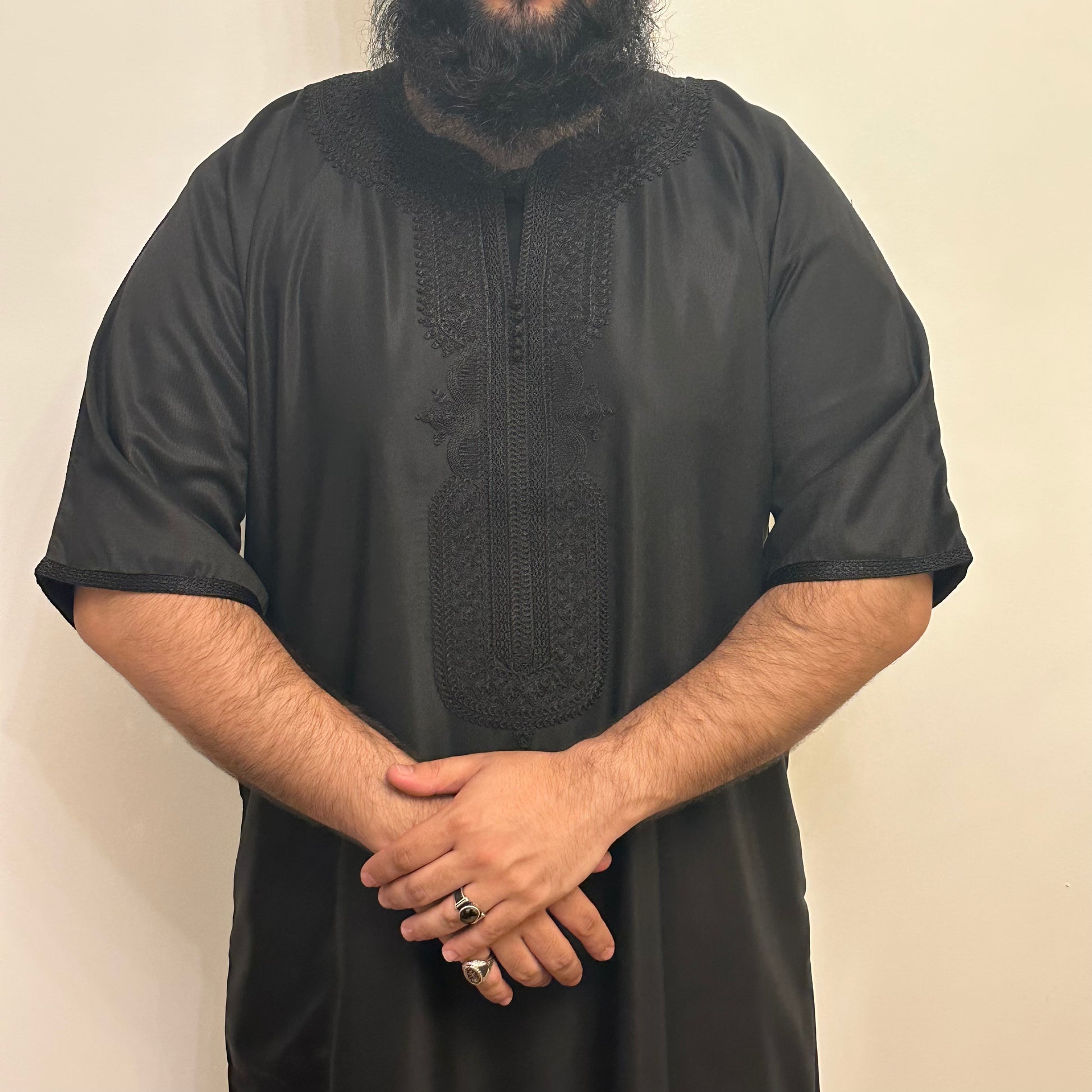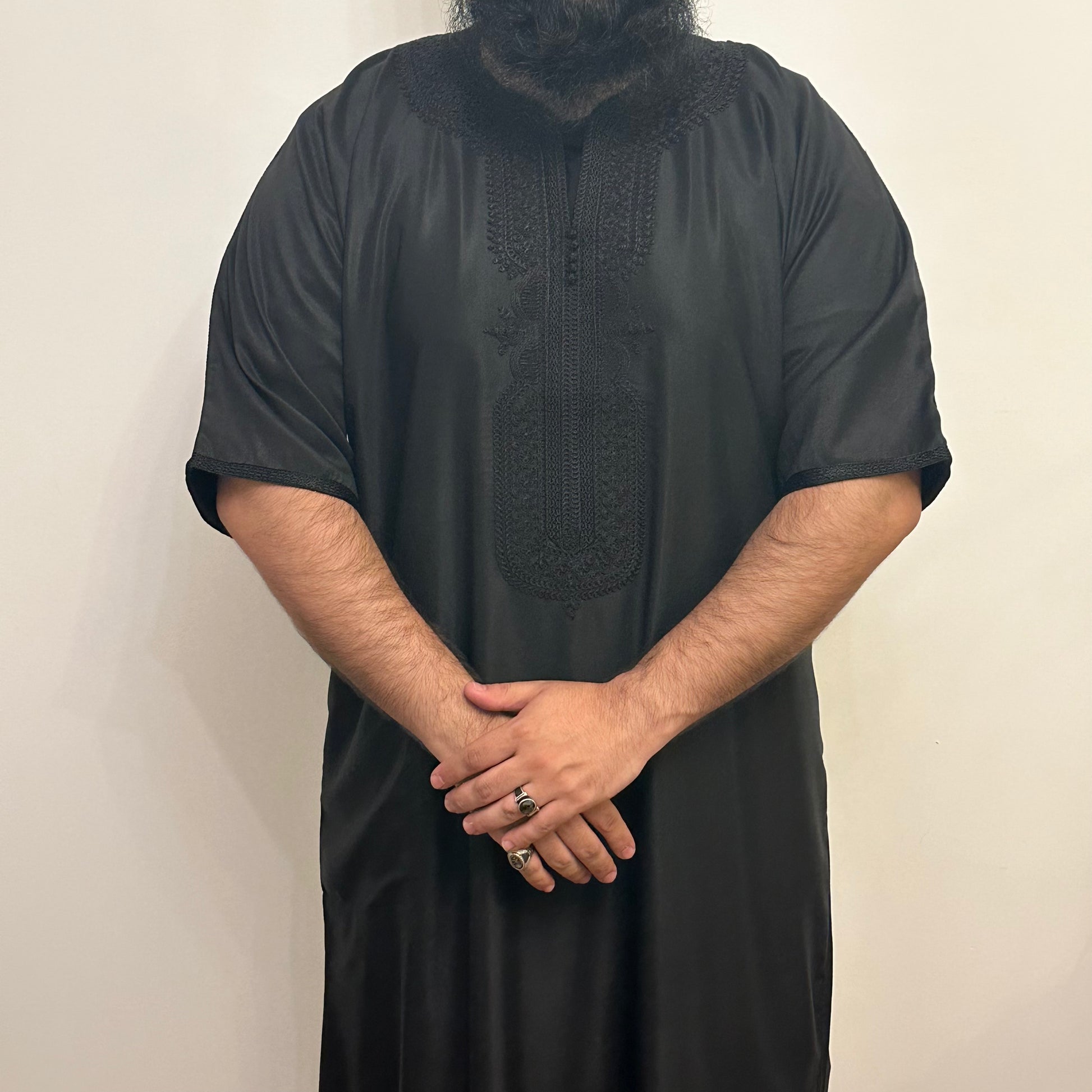 Black on black Moroccan silk effect gabardine short sleeve thobe