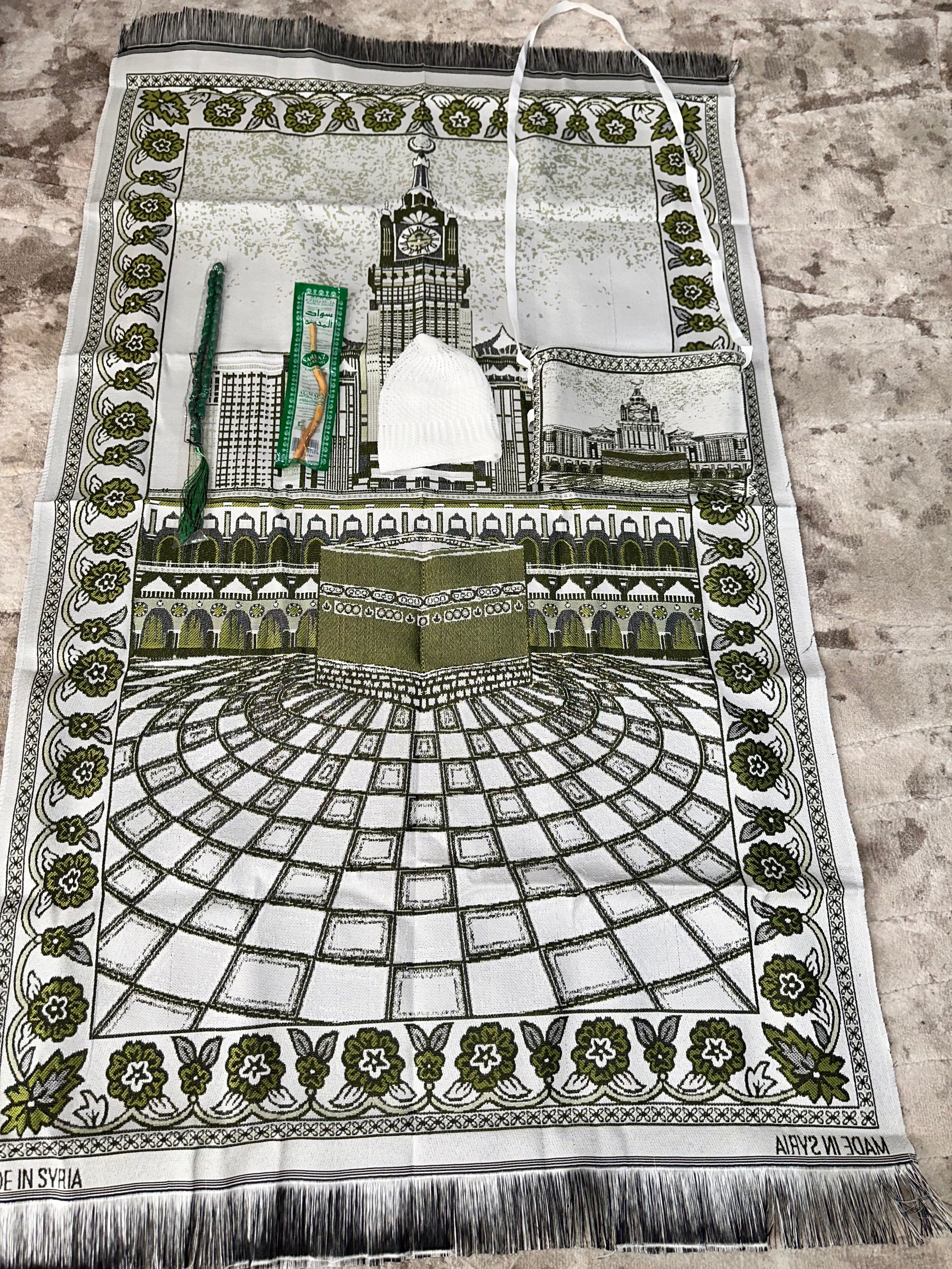 Gift Sets include a travel prayer mat with a protection bag, a tasbih, a miswak and a kufi. The prayer mat features the Haram and Kaba. The perfect combination of must haves when performing ibadaah.