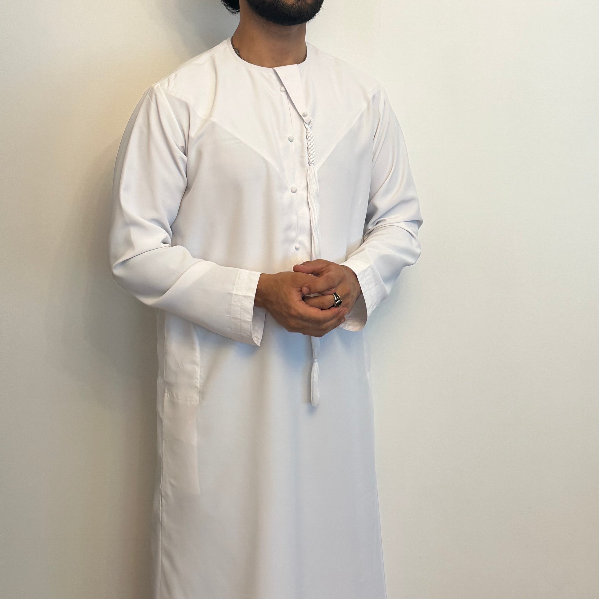 Matte white Emirati thobe with detachable tassel