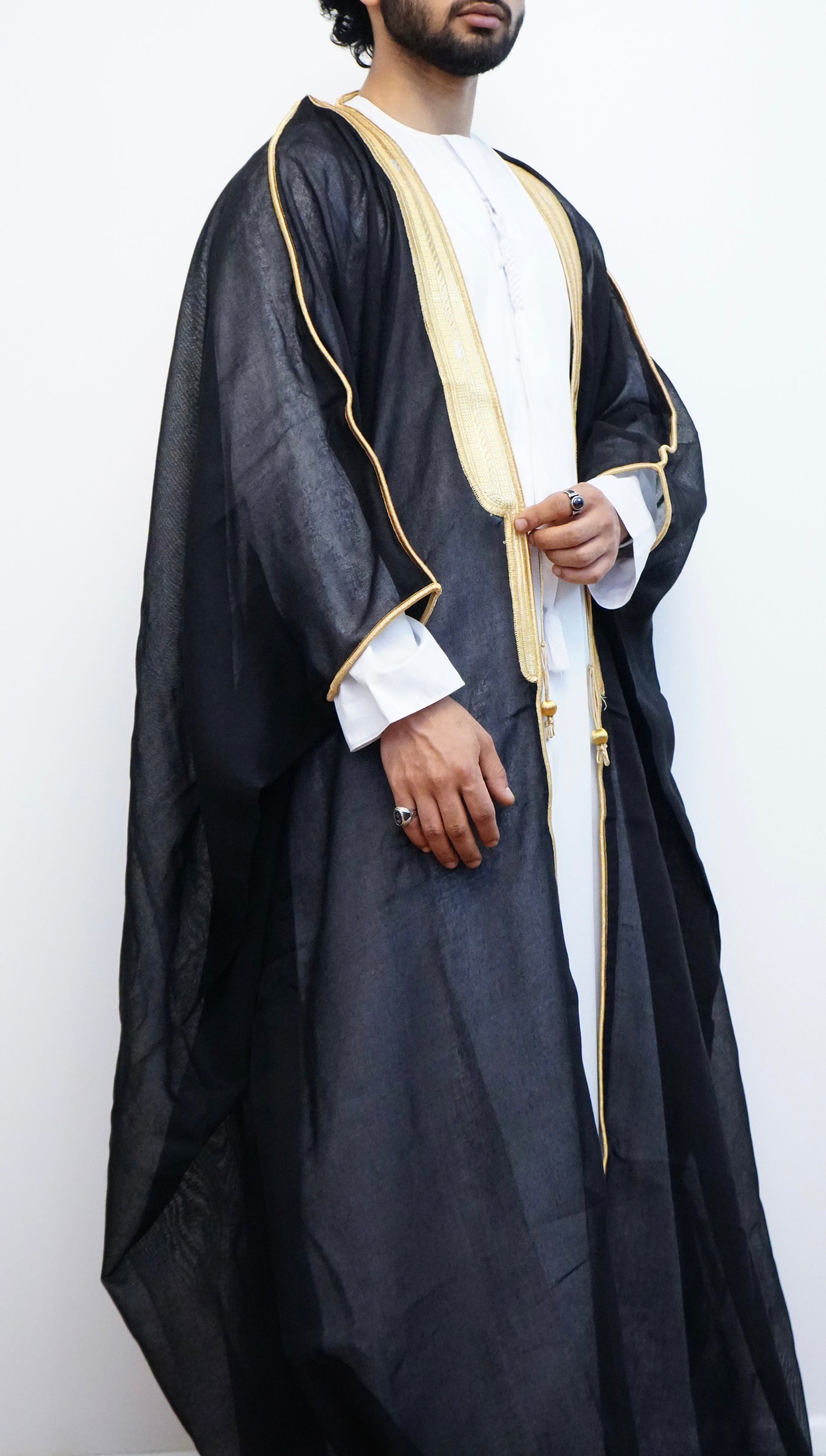Our Premium black bisht has luxury gold detailing accompanied with matching gold strings for tightening to allow for the perfect fit. This is perfect for weddings and any special occasion.